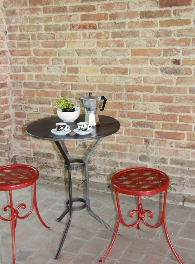 Nymalte stoler og bord under porticoen, april 2014